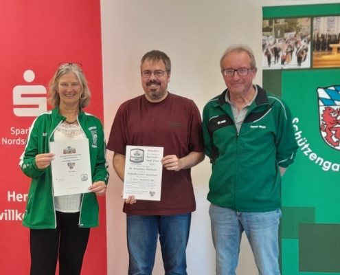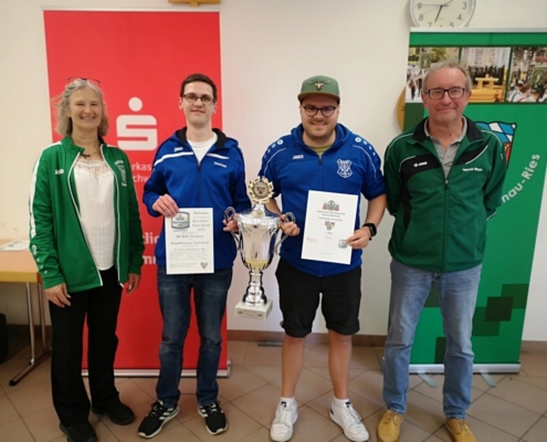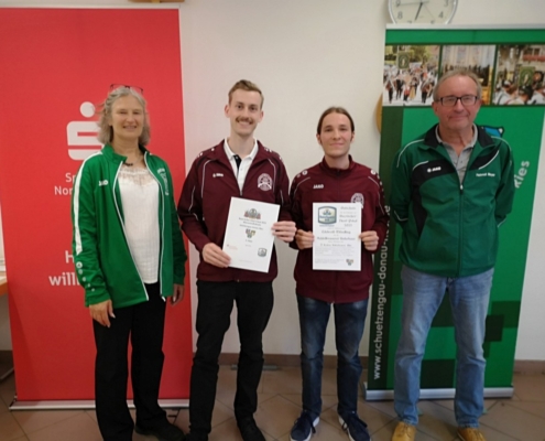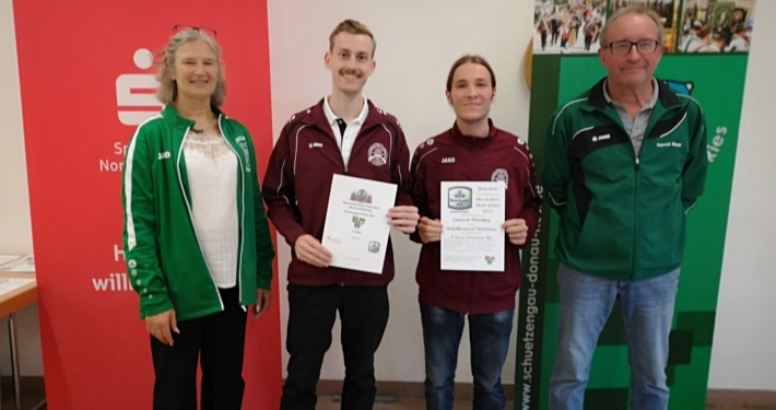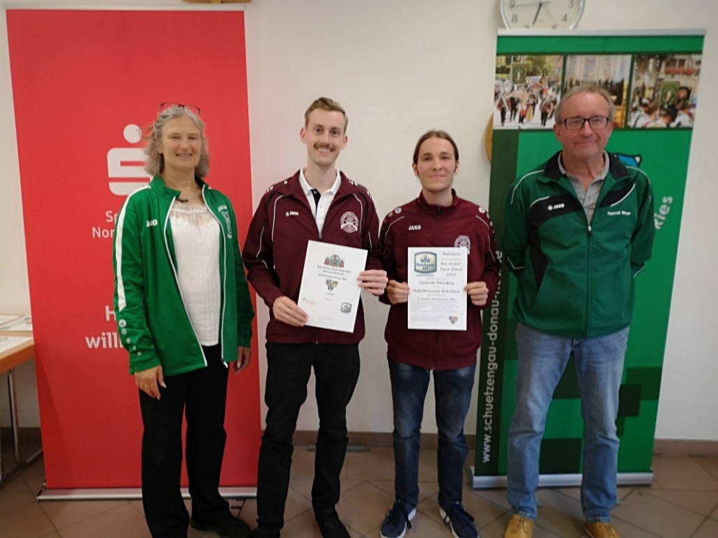 Bei der Siegerehrung freuten sich (von links) die Gauschützenmeisterin Heike Wildfeuer-Fick, die Monheimer Siegerschützen Thomas Templer und Niklas Nigel sowie der  stellv. Gauschützenmeister Helmut Meyer über ihren Erfolg und den Abschluss eines gelungenen Wettkampftages.