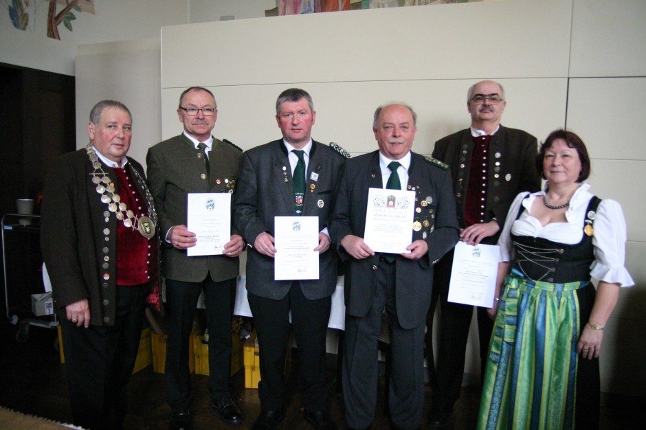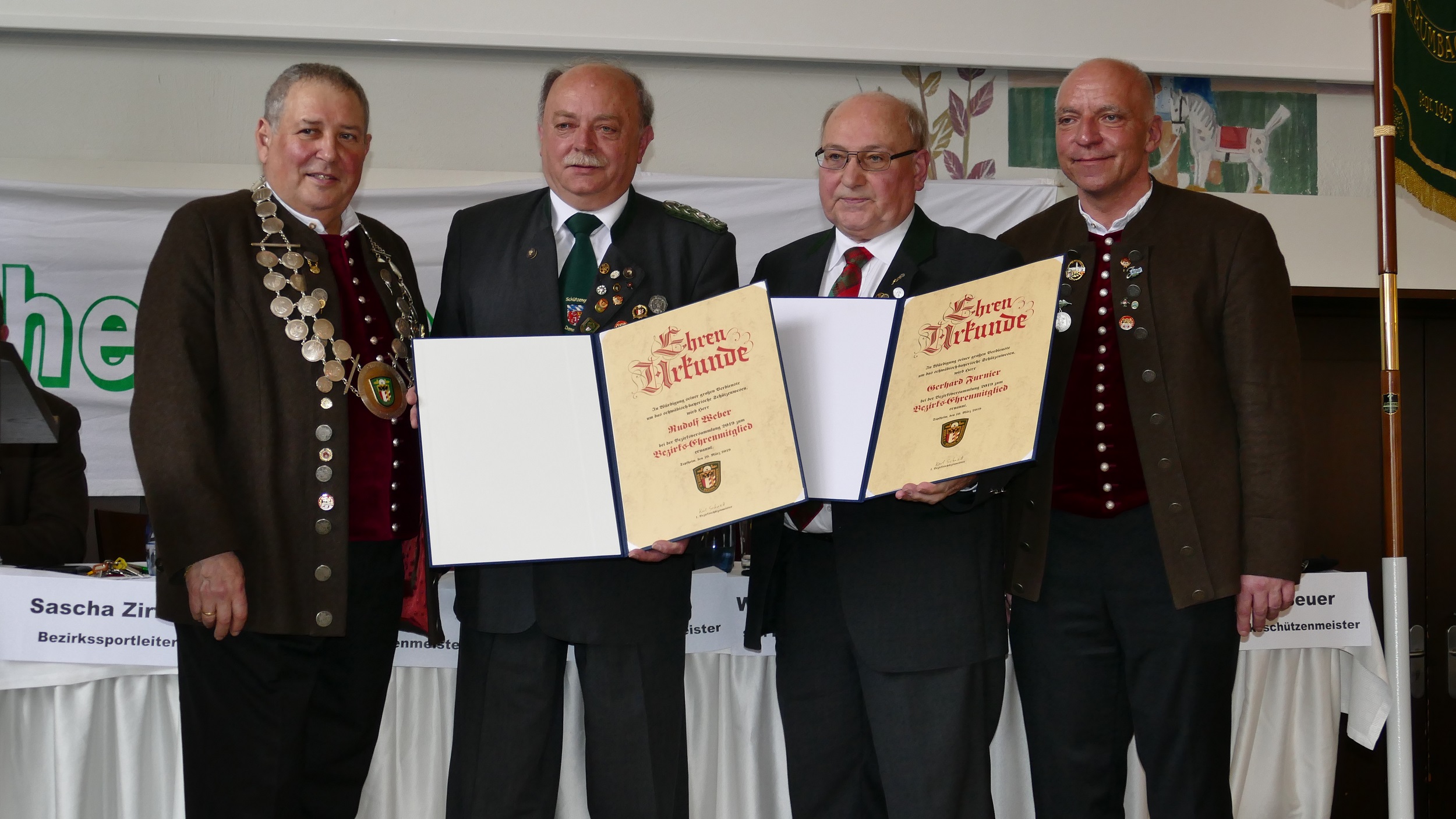 Beim Bezirksschützentag 2019 in Ursberg wurden Rudolf Weber (2.v.l.) und Gerhard Furnier (3.v.l.), beide langjährige Sportfunktionäre, zu Ehrenmitgliedern des Bezirkes Schwaben ernannt. Mit der Ernennung verbunden ist die Verleihung des Doppeladlers in Gold, dies ist die höchste Ehrung die der Bezirk Schwaben vergeben kann.