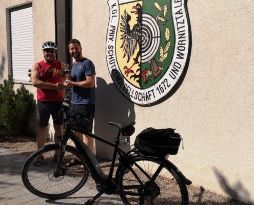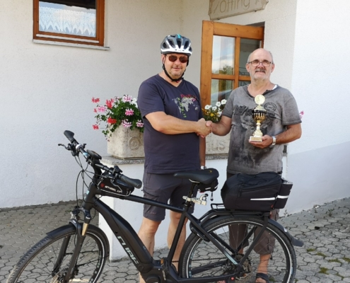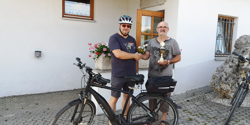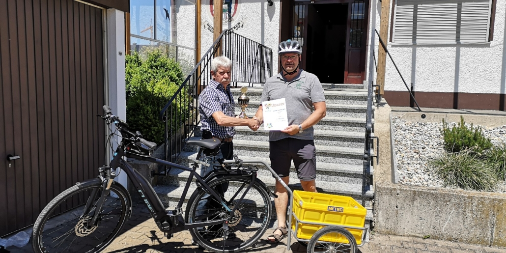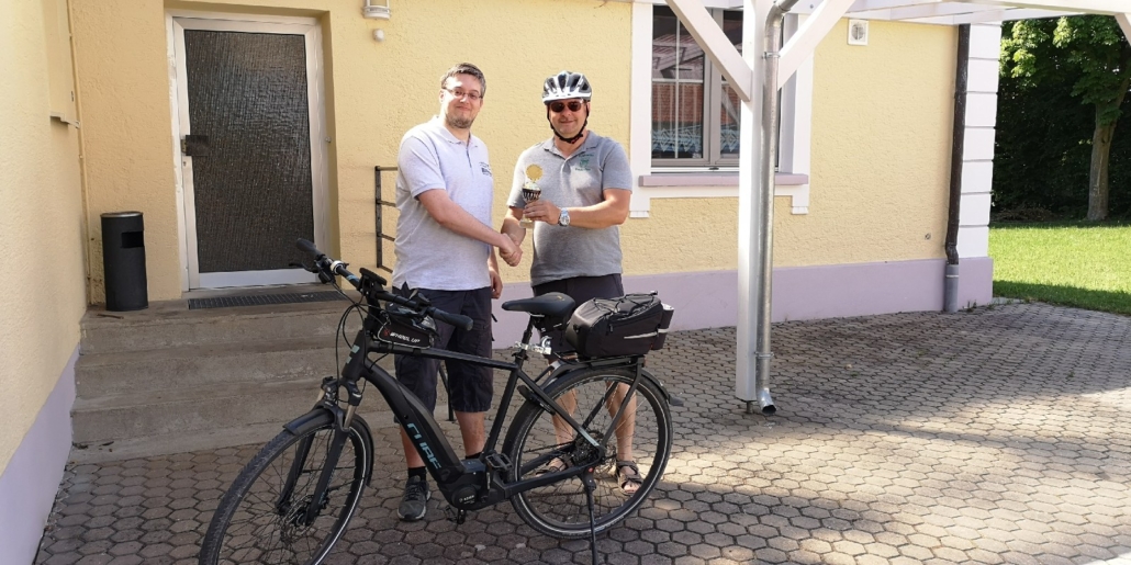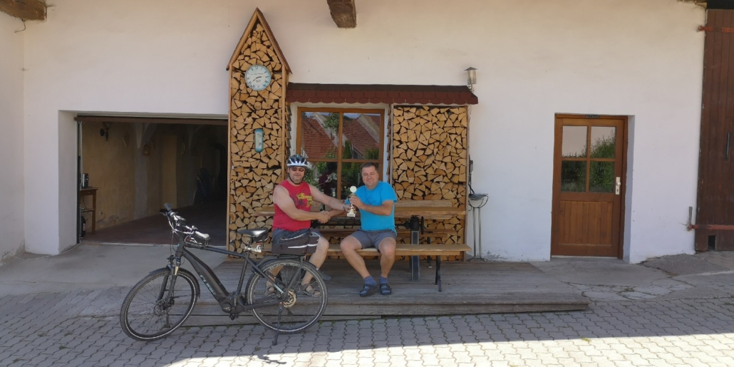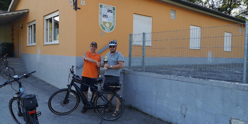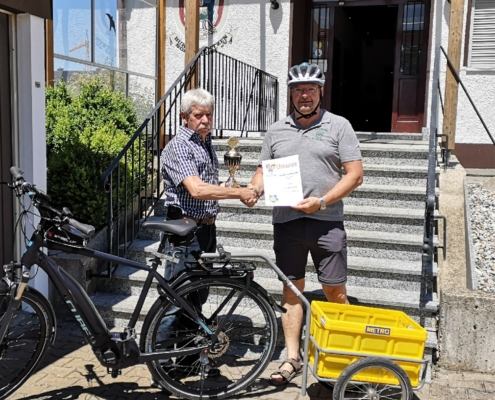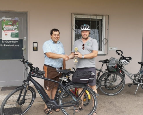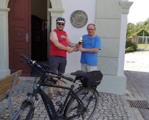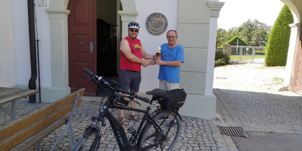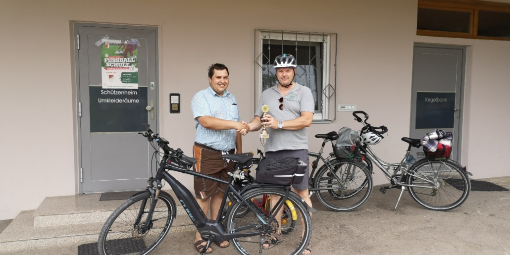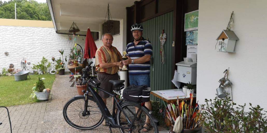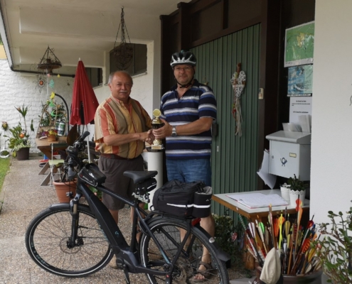 Von Wetterkapriolen unterbrochen, legte er im Zeitraum Juni-August in Begleitung seiner Frau rund 250 km mit seinem (e-)Bike zurück und überbrachte die versprochenen Pokale.