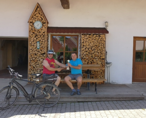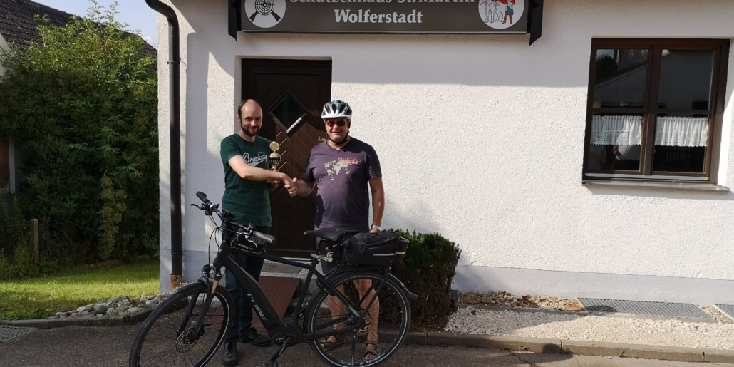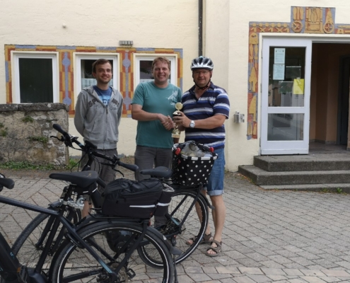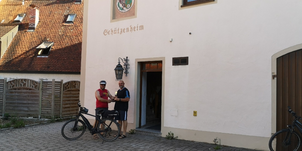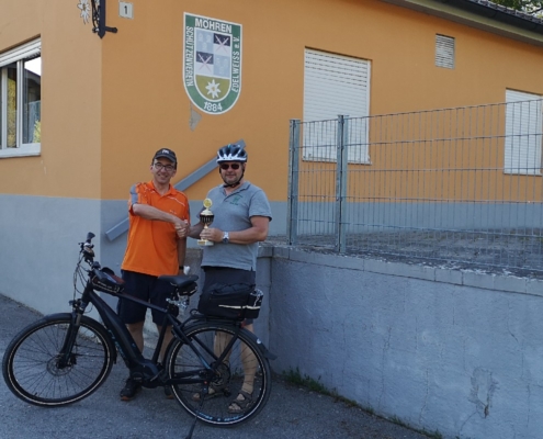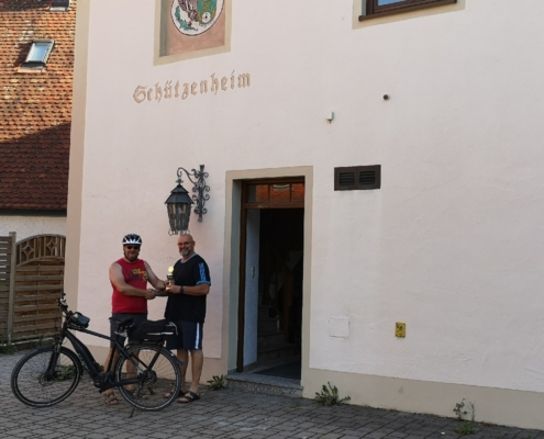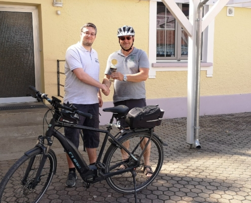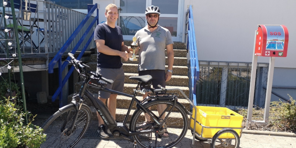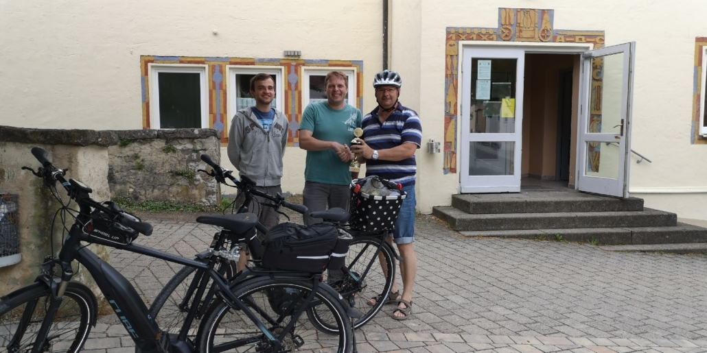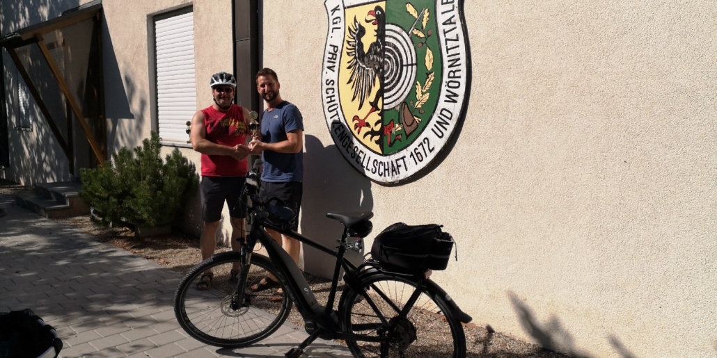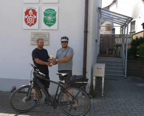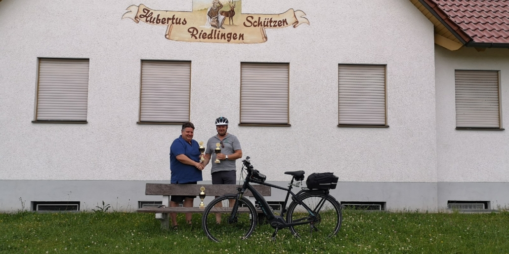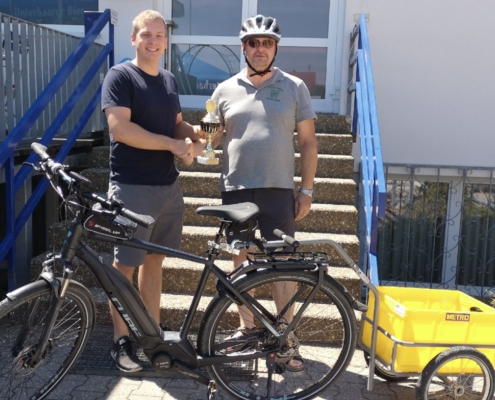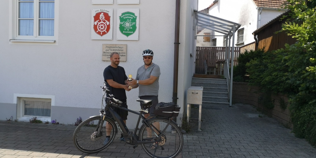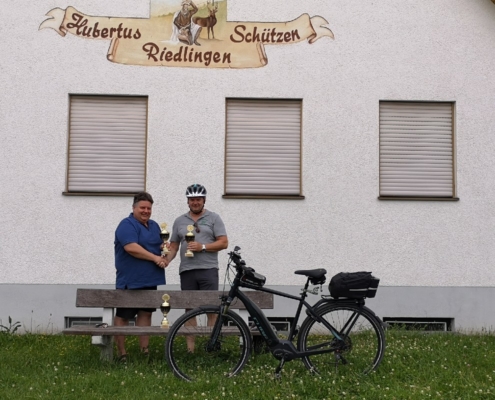 Von Wetterkapriolen unterbrochen, legte er im Zeitraum Juni-August in Begleitung seiner Frau rund 250 km mit seinem (e-)Bike zurück und überbrachte die versprochenen Pokale.